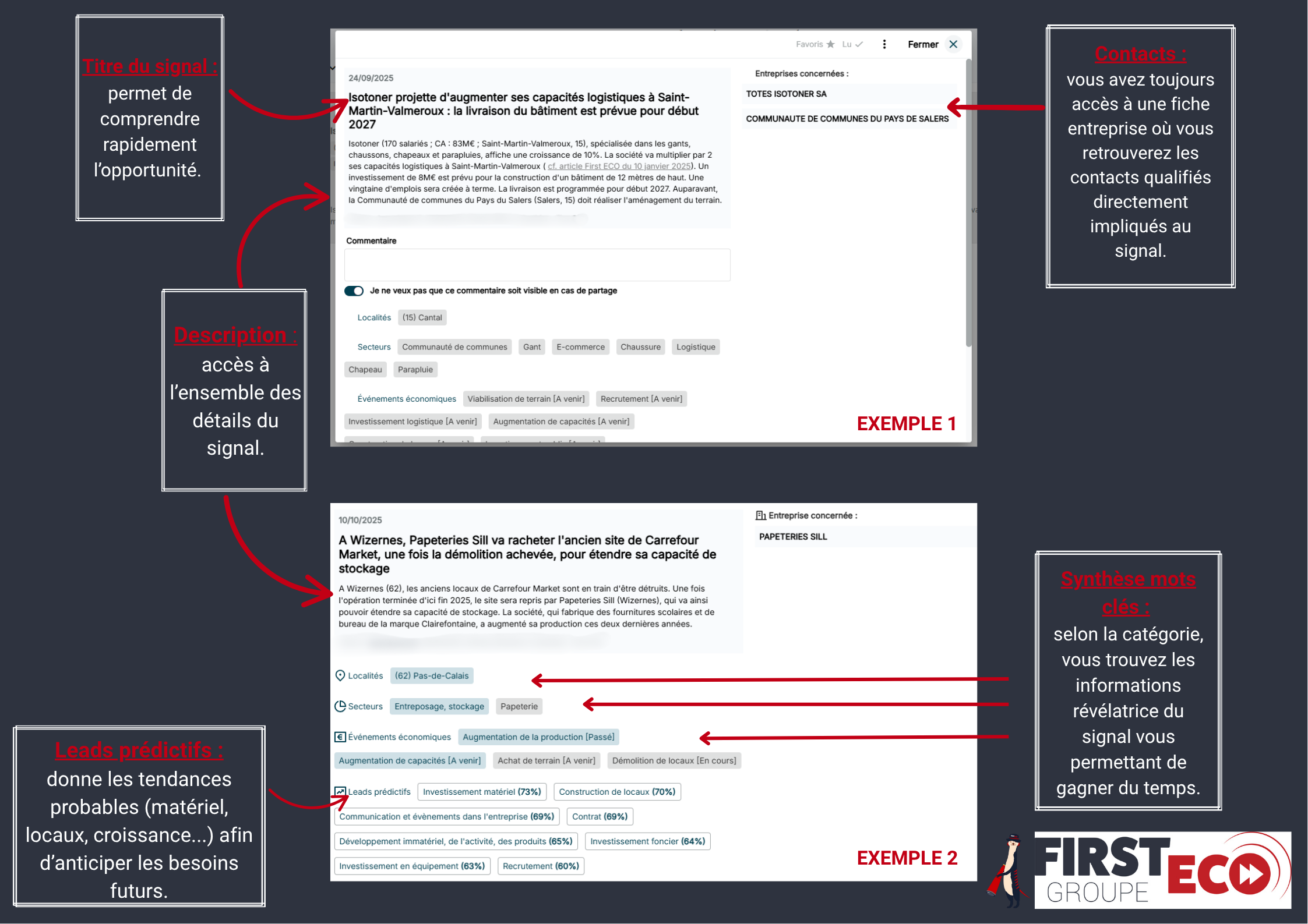 Vous trouverez ci-dessous un exemple de 2 signaux business issus de la veille commerciale publiée par First ECO très intéressant pour votre secteur, montrant dès la lecture du titre l’importance de l’opportunité. Vous trouverez dans le graphe ci-dessous les légendes vous permettant de comprendre la structure d’un signal d’affaire First ECO et les informations clés qui vont être mises à votre disposition.