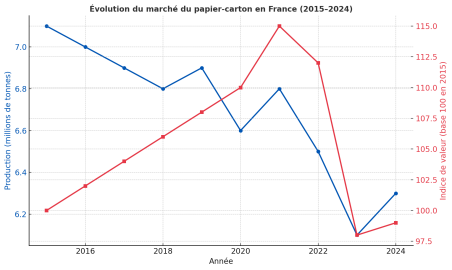 ● Les besoins en carton en France évoluent vite et de manière erratique (forte baisse des volumes en 2023 mais progression significative en 2024). Les origines de ces évolutions sont nombreuses et contradictoires : transition écologique, nouvelles normes, développement e-commerce…